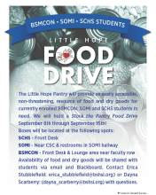 Center for Student Success Launches The Little Hope PantryOur Center for Student Success has started the Little Hope Pantry (LHP) initiative on the Bon Secours Memorial College of Nursing, Southside College of Health Sciences and School of Medical Imaging campuses. Faculty and staff are encouraged to bring non-perishable items to donate to the LHP starting this week through next Friday, September 16. Donation boxes are labeled at all 3 locations. Please see the attached food drive flyer. |